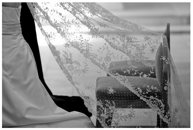 From all these images, from this day, one stands out that I chose to keep. We can’t see your face, we wouldn’t recognize you – nor would we recognize your husband. We see you kneeling by the side of your beloved, white on black, light on dark. I remember your faces bent and harmonious. And a veil with white lace, coming from your hair and resting very elegantly on your armchair thanks to your mother (again). This picture was taken by someone else than I and I find it special and peaceful. What you gave us on that day was just a symbol but it was precious, you gave us the possibility to rejoice with you and share a piece of your happiness. You both were like this veil, present and invisible, exposed to our scrutiny yet protecting your shared secrets, your details, your still daily banter and words.